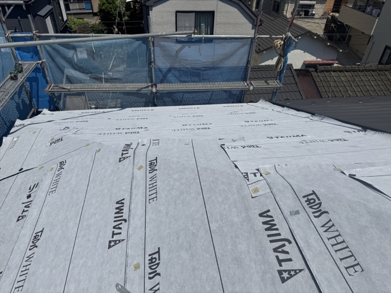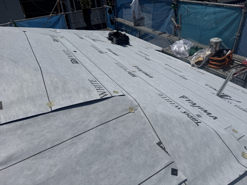 作業の流れはいつもどおりに、まずは既存の棟・雪止めを撤去してルーフィングの施工です。