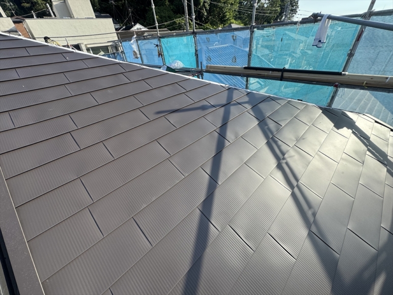 次に屋根材本体の施工に移り順次葺き上げていきます。今回はコスト面から乱葺きでの施工です。