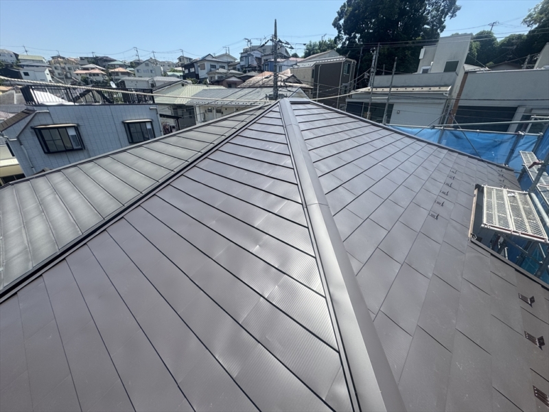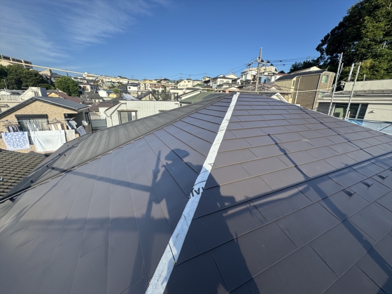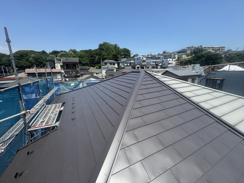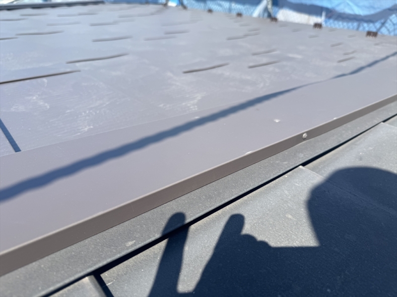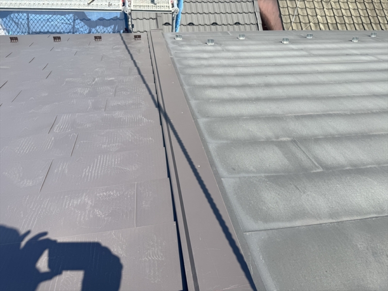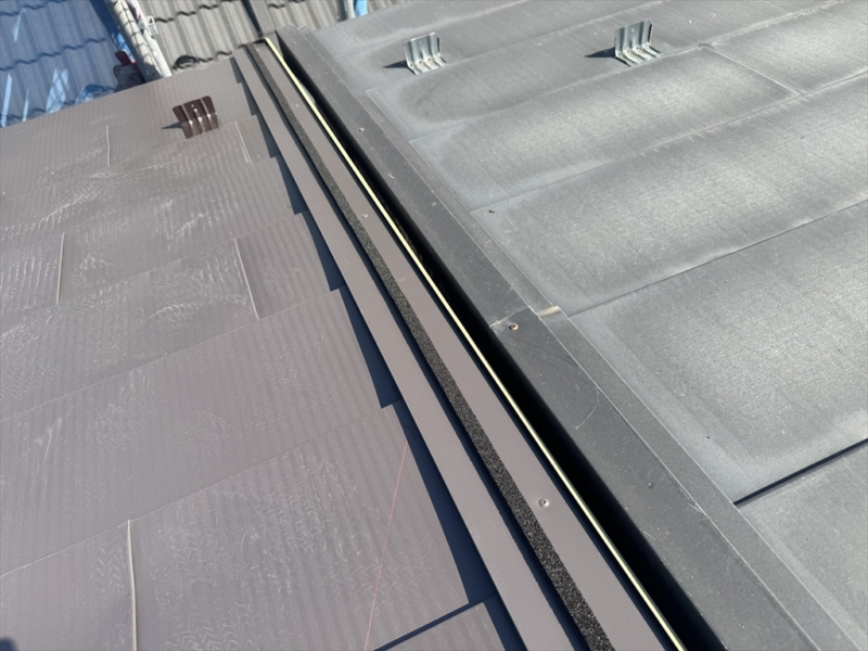 お隣様の屋根もカバールーフにて工事済みでありましたが、段葺きでの施工の為今回当社で施工した屋根よりも若干高さがありました。今回は建物が動くことをお考慮し施主様側に受けの板金を、お隣様側に被せの板金を取り付けるエキスパンション形式で施工することにしました。