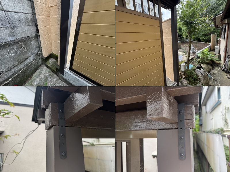 傷んでいる柱は交換したいところですが費用の面もあり板金にて包み込み屋根株の木枠は塗装で仕上げます。既存門塀のケレンが一番大変でしたができる限りしっかりと剥がして残った塗膜との段差は模様をつけることで対処しました。