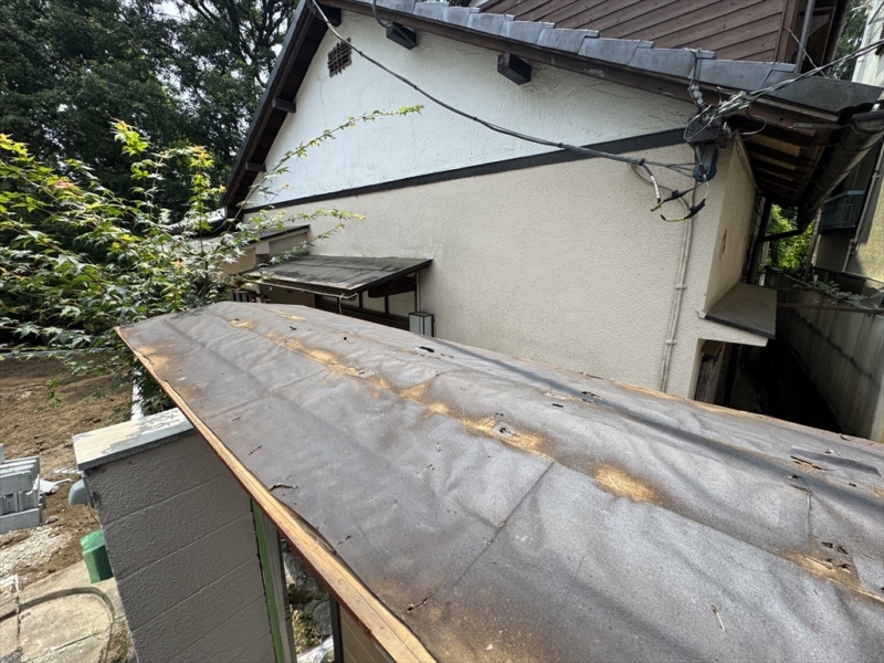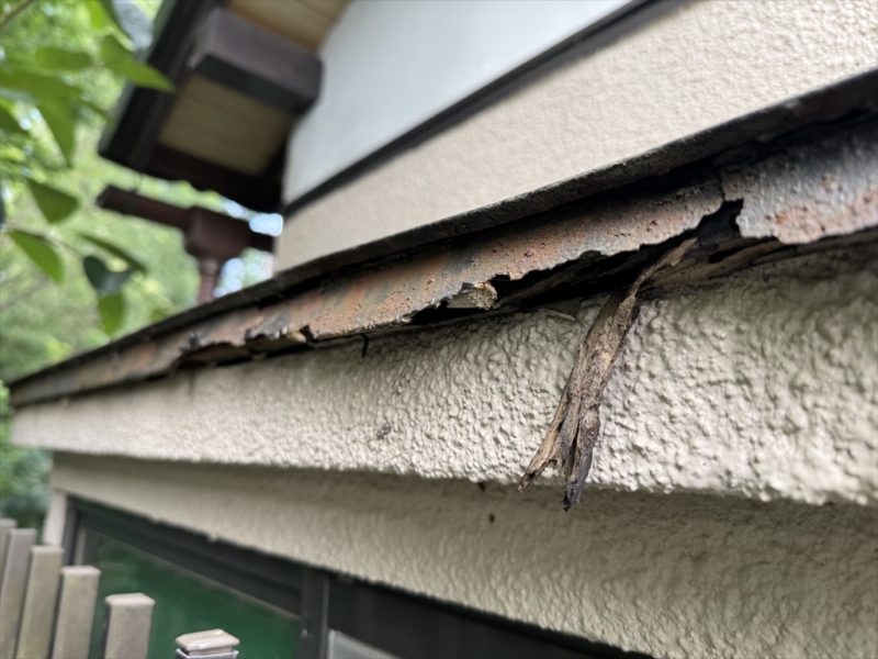 軒先唐草が錆びて朽ちているので一式板金を剥がして軒先木下地(広小舞)から直すことも考えましたが幸いにも垂木がまだしっかりとしていたので軒先板金と唐草を撤去して上から新たに庇板金を被せることにしました。軒先唐草の状態がこちら。