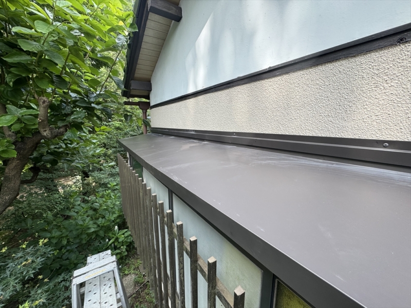後付感を出さない、コーキングの劣化を防ぐ意味での化粧水切りを取り付けて庇は完成です。