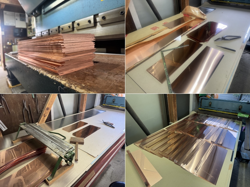 まずは既存の軒先唐草を数か所撤去し寸法を測って加工をしていきます。既成品はもちろんありませんので必要分を銅板の定尺板から切り落とすのですが、これも銅板の柔らかさ故に動力の機械で切断すると微妙に伸びてしますので昔ながらの手動の押切り(ギロチンのようなもの)で一枚一枚切断します。今回は実に300枚強必要でしたので黙々と作業に勤しみました。この加工の精度で現場での進捗度合いが決まりますからね。