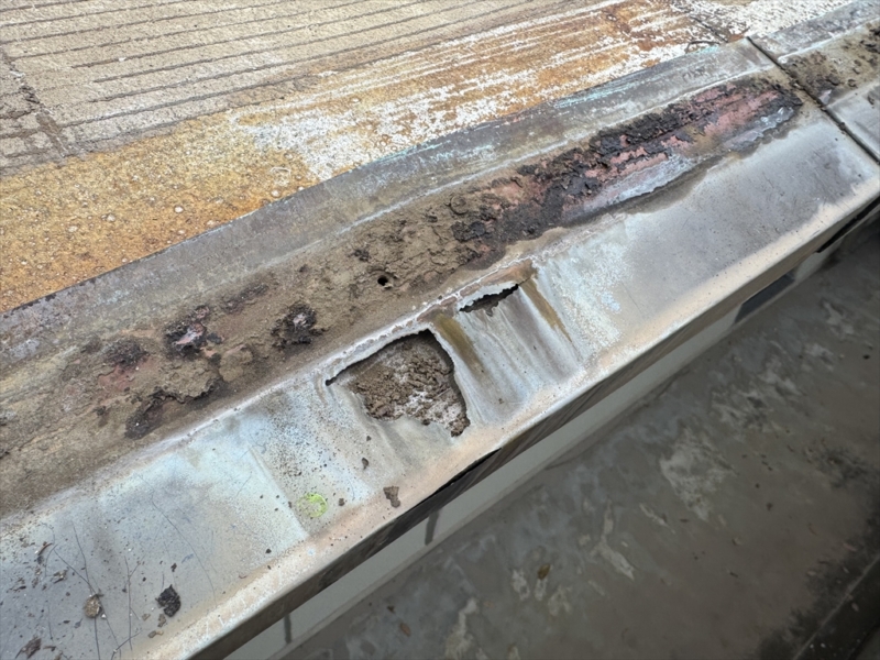 銅板は錆びない材料ではありますが酸性雨による浸食や異種金属による電食によりこのように穴が開いてしまいます。非鉄金属なので加工がし易い反面、傷や凹みが付きやすいので扱いが難しい部分もあります。どの材料にも一長一短があるということですね。