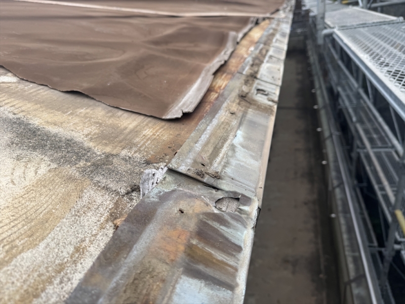 既存は破風を銅板で仕上げておりその屋根軒先の唐草に絡め屋根自体はシート防水で仕上げてありました。今回はシート防水の交換にあたり腐食している銅板の軒先唐草も一式交換することになりました。