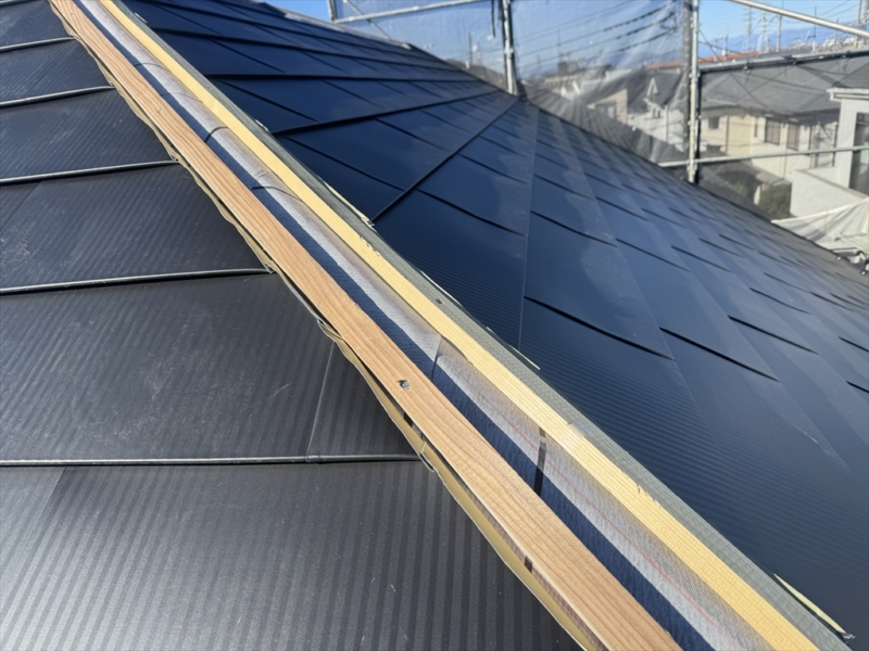 この桟木に棟板金の土台となる貫板を取り付けます。こうすることで次回棟板金を交換する際に屋根材本体を傷めることなくスムーズに交換することが可能となり同時に屋根材に触れることがないので直接雨水の影響を受けることがなく耐久性に大きく貢献する施工方法なのです。手間がかかる作業の為にこの納め方をする業者は最近少なくなりました。