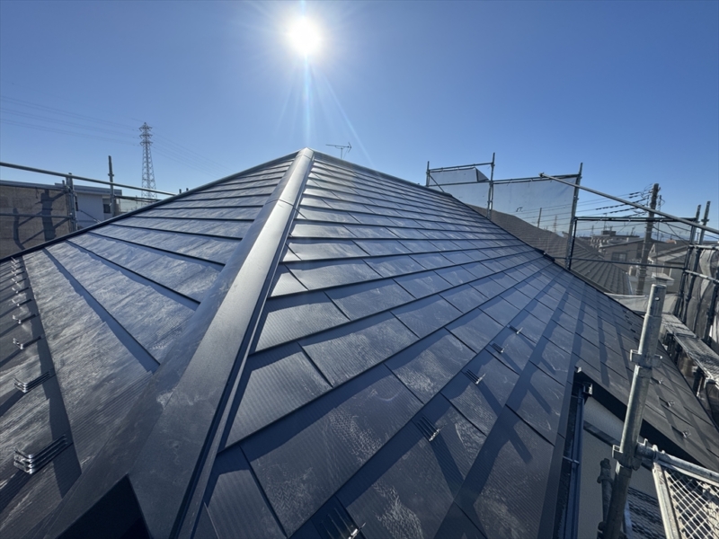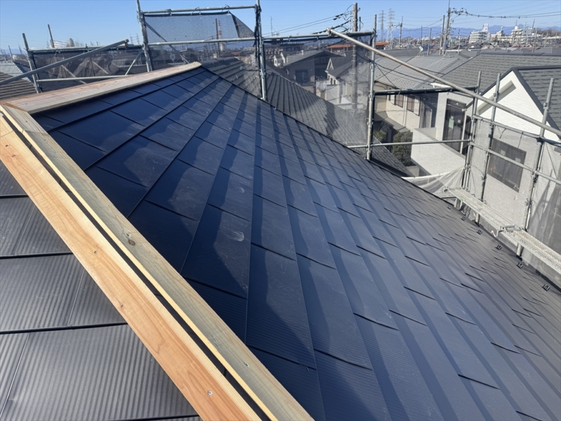 各種役物を取り付けたから屋根材本体を施工します。今回はIGヒランビー極みを乱葺(回し葺き)で仕上げます。