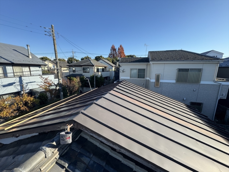 築年数が70年を超える建物で40年近く前に瓦屋根から瓦棒葺きに葺き替えを行っていました。前回は一部分のみの修理でしたが、現状から部分工事での対応では雨漏りとのいたちごっこになる可能性が大きいのでカバー工法をお勧めしました。