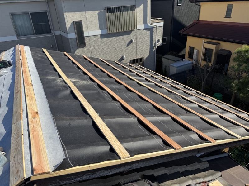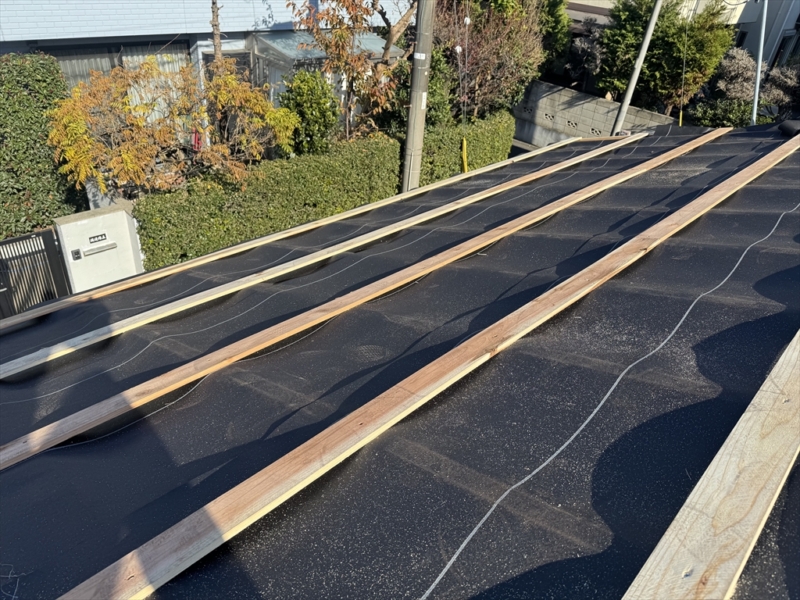 まずは既存屋根材の上に防水紙を敷き込み15mmの貫板を流して屋根下地を作り、